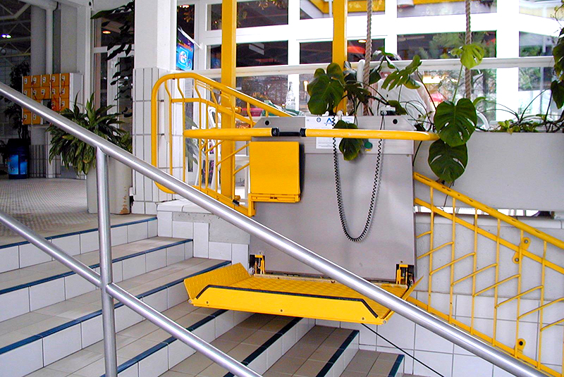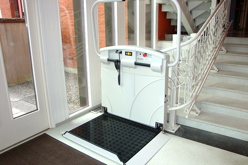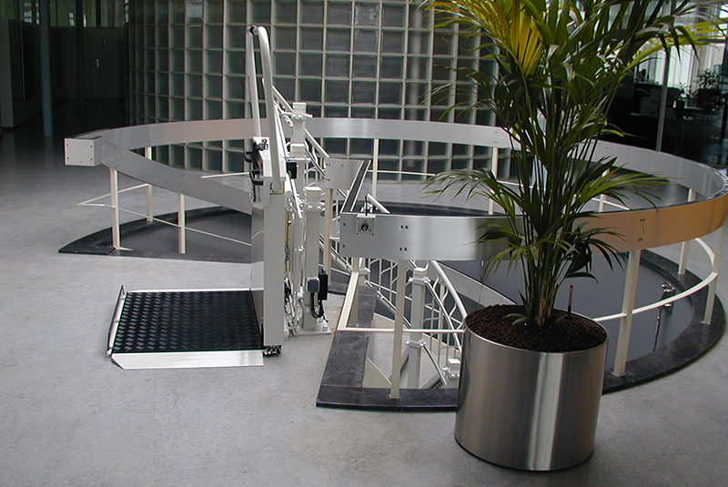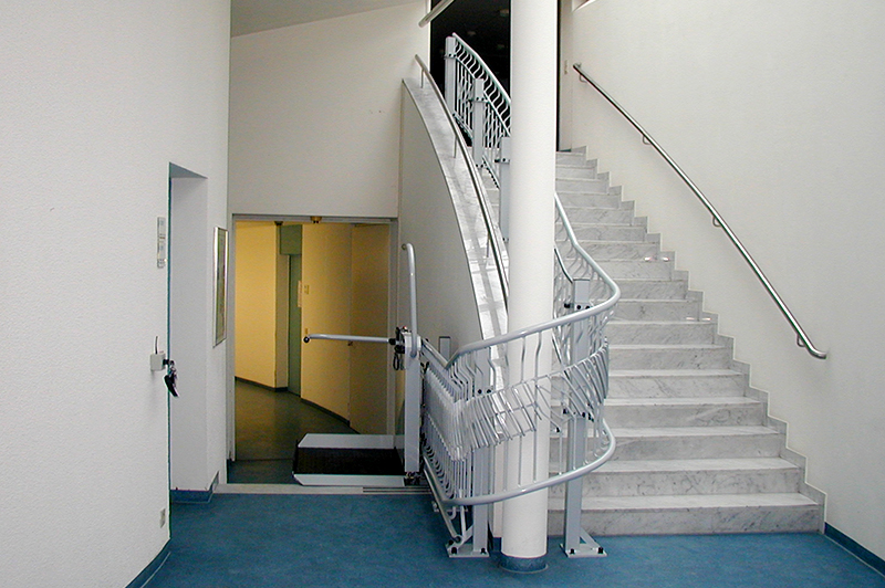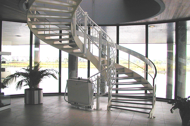 Die Kurvenfahrt ist bei räumlichen Treppen, auch mit Steilfahrt, möglich. Der Lift umfährt das Treppenauge.